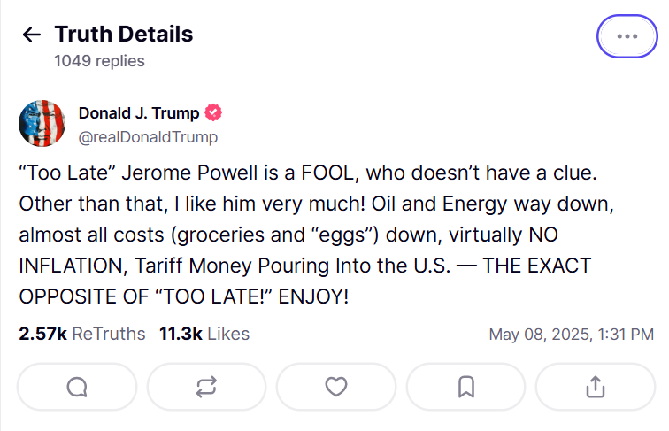 Trump, "Jerome Powell hiçbir fikri olmayan bir aptal. Bunun dışında onu çok seviyorum! Petrol ve enerji çok düştü, neredeyse tüm maliyetler düştü, neredeyse enflasyon yok, tarife parası ABD'ye akıyor." açıklamasında bulundu.