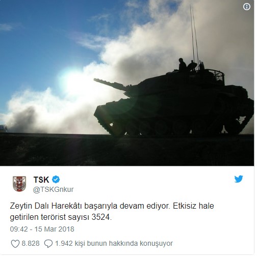 Afrin'e Zeytin Dalı Harekatı'nda bugün 55. gün. 20 Ocak'ta başlayan harekatta şu ana kadar 3525 terörist etkisiz hale getirildi.
