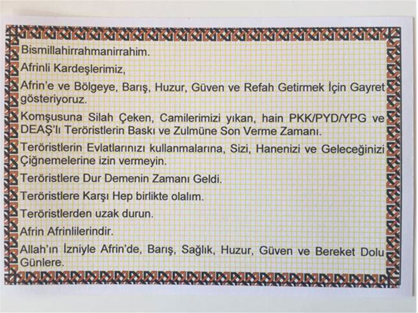 TSK, Özgür Suriye Ordusu'nun (ÖSO) desteğiyle 20 Ocak'tan bu yana Afrin'de düzenlediği Zeytin Dalı Harekatı kapsamında bölge halkına yönelik Türkçe, Arapça ve Kürtçe hazırlanan bildirileri havadan attı. TSK'nın, halka PKK/PYD ve DEAŞ terör örgütlerine karşı birlikte mücadele çağrısı yaptığı bildiriye "Besmele" ile başlandı.