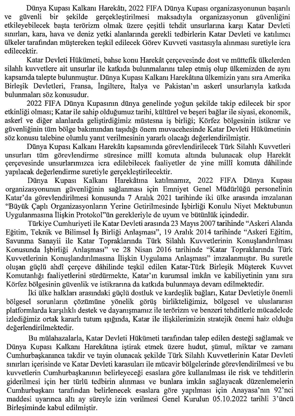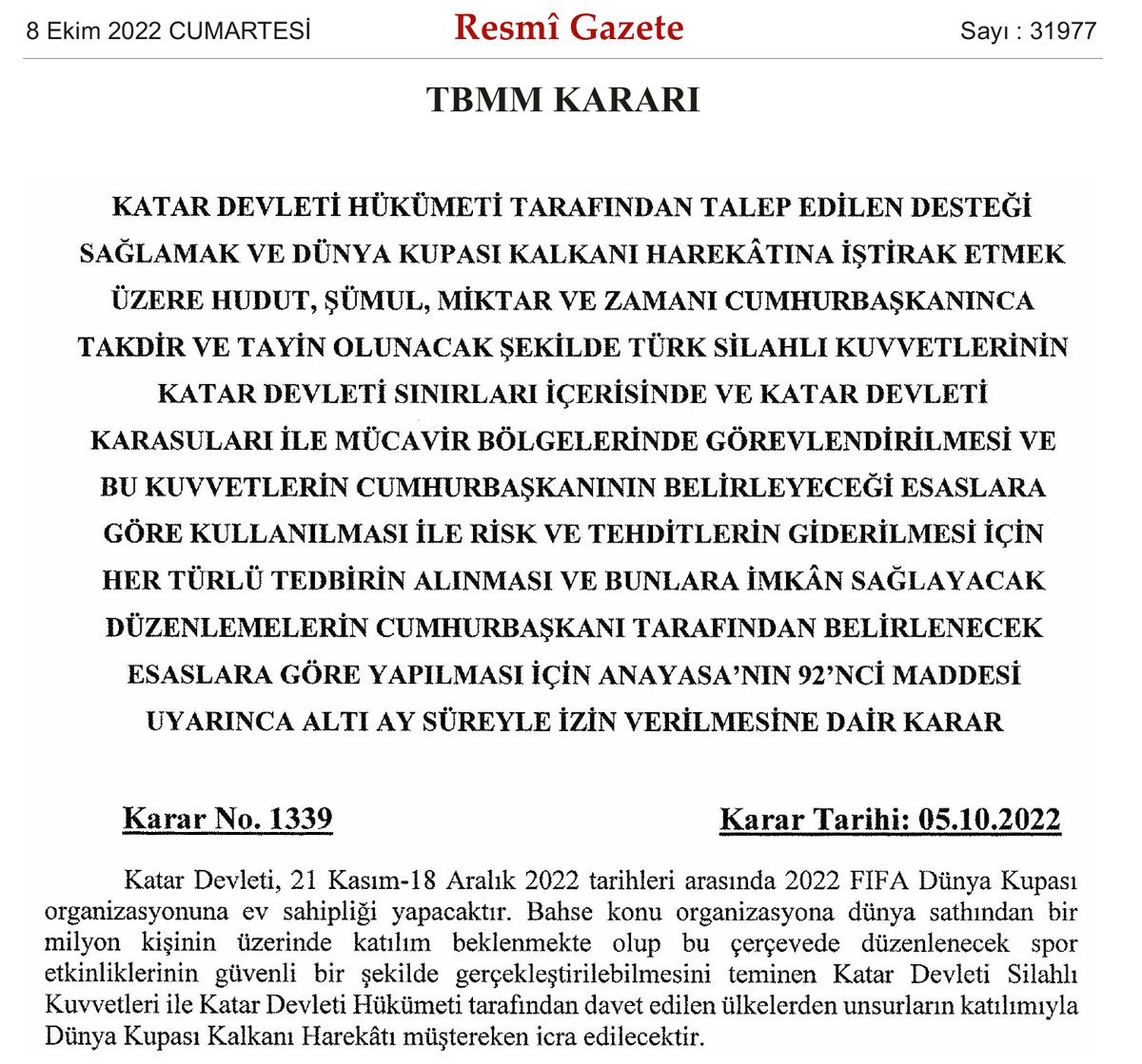Türk Silahlı Kuvvetlerinin (TSK), Katar'da Dünya Kupası Kalkanı Harekatı kapsamında 6 ay süreyle görevlendirilmesine ilişkin hafta içinde TBMM Genel Kurulunda kabul edilen tezkere Resmi gazetede yayımlanarak yürürlüğe girdi.