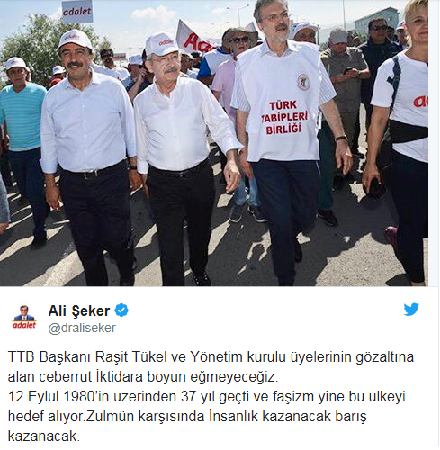 CHP milletvekili Ali Şeker, twitter hesabından Afrin harekatı için "savaş bir halk sağlığı sorunudur" diyen Türk Tabipler Birliği yöneticileri hakkında gözaltı kararı verildiğini duyurdu. Hürriyet'te yer alan habere göre sabah saat 06.30 itibaren TTB Merkez Konseyi üyesi 11 isim gözaltına alındı.