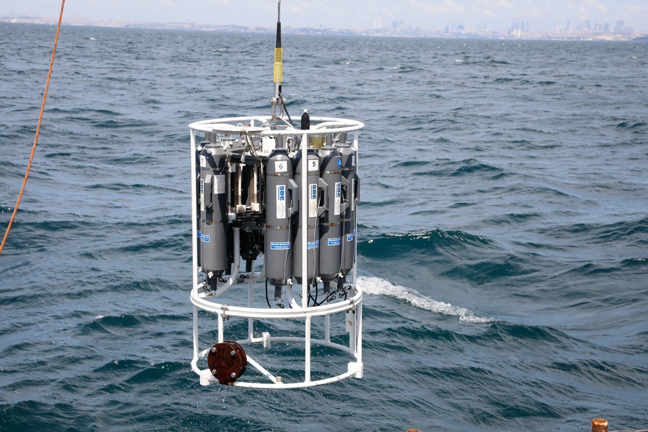 Araştırma grubunun Başuzman Araştırmacısı Sabri Mutlu, 'Rozet Örnekleme' cihazını tanıtarak, Marmara Denizi'nin oksijen seviyesinden bahsetti. Mutlu, denizin alt tabakasında oksijenin tükenme seviyesine geldiğini belirterek, "Deniz yüzeyinden deniz tabanına kadar cihazı indiriyoruz, daha sonrasında üzerindeki algılayıcılar sayesinde su kütleleri tayin ediyoruz. Cihazımız deniz tabanından yüzeye doğru gelirken üzerindeki şişelerden su örnekleri alıyoruz. Aldığımız su örneklerini hem güvertedeki laboratuvarda hem de ofisteki laboratuvarda devam ettiriyoruz" diye konuştu.