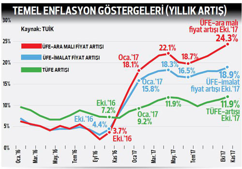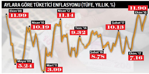 TÜRKİYE İstatistik Kurumu (TÜİK) verilerine göre ekimde aylık yüzde 1.8 olan beklentilerin üzerinde yüzde 2.08 arttı ve yıllık enflasyon yüzde 11.90 ile 9 yılın zirvesine çıktı. En son Ekim 2008’de enflasyon yüzde 11.99 ile zirvedeydi. Enflasyonu arttıran ise giyimde kış sezonunun zamları, taze sebze ve meyvelerde yine kış zammı ile peynir, süt, tereyağ gibi beyaz ürünlerdeki artışlar oldu. Ayrıca otomobilde, LPG’de ve mazottaki zamlar da enflasyonu arttırıcı etki yaptı. Giyimde kış sezonu kazak, mont kaban yüzde 30-39 arası büyük zamlarla başladı. Domateste yüzde 14, biberde ise yüzde 25 fiyat artışı var. Yurtiçi üretici fiyatları da ekimde yüzde 1.71 arttı yıllık üretici enflasyonu ise yüzde 17.28’e fırladı. Bu 2008 Temmuz’undan beri görülen en yüksek seviye.