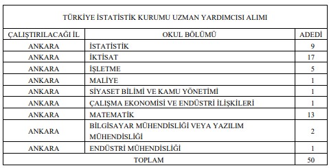 Türkiye İstatistik Kurumu (TÜİK) Türkiye İstatistik Kurumu Uzmanı olarak yetiştirilmek üzere sınavla, merkez teşkilatına 50 adet Türkiye İstatistik Kurumu Uzman Yardımcısı alacak.