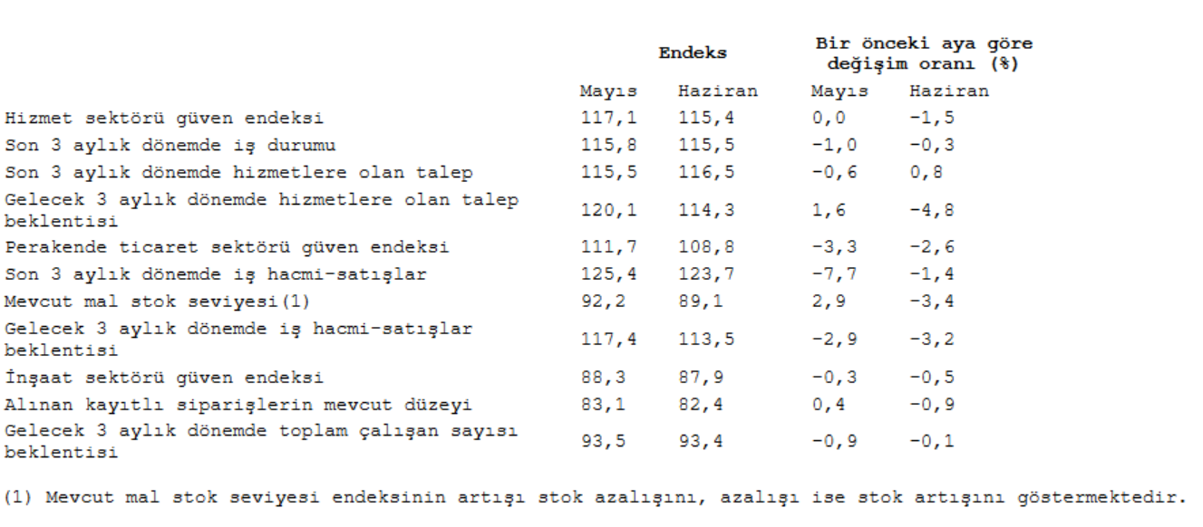 Mevsim etkilerinden arındırılmış güven endeksi haziran ayında bir önceki aya göre; hizmet sektöründe %1,5 oranında azalarak 115,4 değerini, perakende ticaret sektöründe %2,6 oranında azalarak 108,8 değerini ve inşaat sektöründe %0,5 oranında azalarak 87,9 değerini aldı.