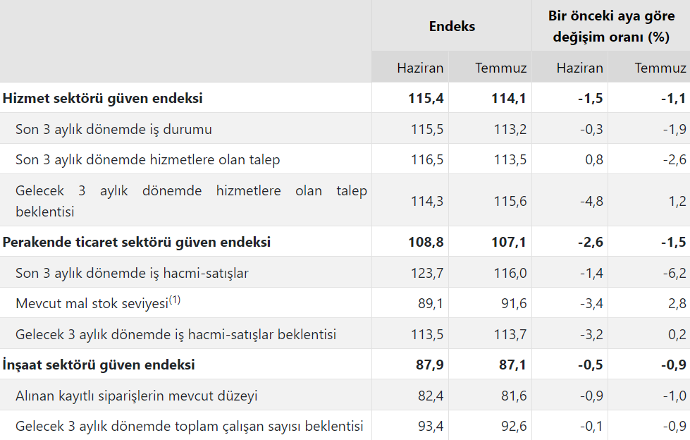 Türkiye İstatistik Kurumu (TÜİK) tarafından yapılan açıklamaya göre, mevsim etkilerinden arındırılmış güven endeksi temmuz ayında bir önceki aya göre; hizmet sektöründe %1,1 oranında azalarak 114,1 değerini, perakende ticaret sektöründe %1,5 oranında azalarak 107,1 değerini ve inşaat sektöründe %0,9 oranında azalarak 87,1 değerini aldı.