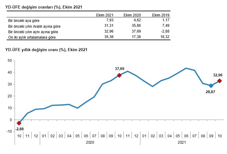 TÜİK verilerine göre, YD-ÜFE (2010=100) 2021 yılı Ekim ayında bir önceki aya göre %7,93, bir önceki yılın Aralık ayına göre %31,31, bir önceki yılın aynı ayına göre %32,96 ve on iki aylık ortalamalara göre %35,36 artış gösterdi.