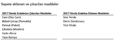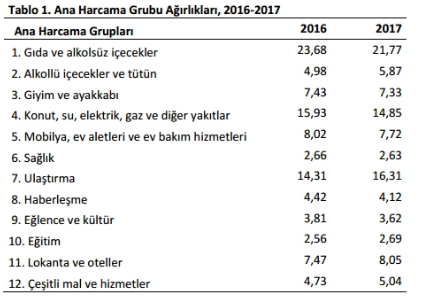 TÜİK Başkan Vekili Mehmet Aktaş, "2017 TÜFE'de kullanılacak ağırlıklarda düzenleme yaptık. Ana harcama gruplarında yer alan gıda ve alkolsüz içecekler grubunun ağırlığı 23,68'den 21,77'ye düşürüldü. Konut, su, elektrik, gaz ve diğer yakıtlar grubunun ağırlığı 15,93'ten 14,85'e, giyim ve ayakkabı grubunun ağırlığı da 7,43'ten 7,33'e çekildi" dedi.