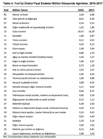 2017 Yılında Yurt İçi Üretici Fiyat Endeksi Kapsamına Eklenen Ürünler
