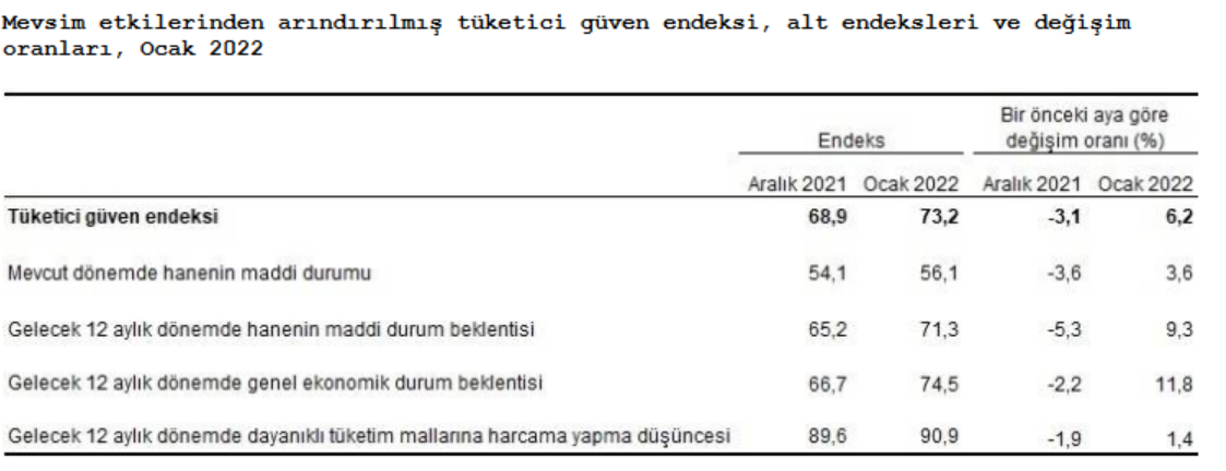 TÜİK ve Türkiye Cumhuriyet Merkez Bankası iş birliğiyle yürütülen "Tüketici Eğilim Anketi" sonuçlarından hesaplanan mevsim etkilerinden arındırılmış tüketici güven endeksi, ocakta 2021'in Aralık ayına göre yüzde 6,2 arttı. Aralıkta 68,9 seviyesinde olan endeks, ocakta 73,2'ye yükseldi.