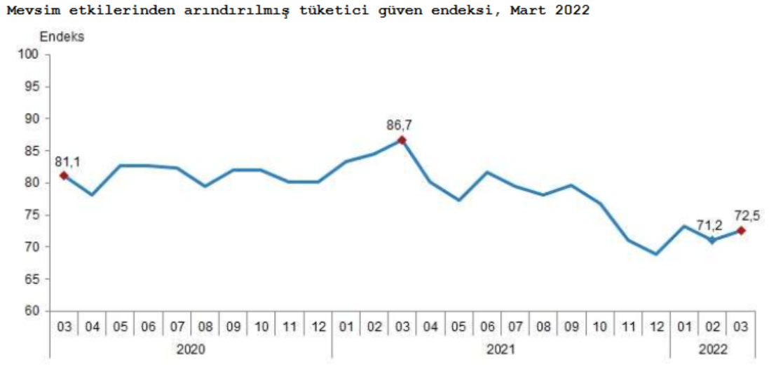 Türkiye İstatistik Kurumu ve Türkiye Cumhuriyet Merkez Bankası işbirliği ile yürütülen tüketici eğilim anketi sonuçlarından hesaplanan mevsim etkilerinden arındırılmış tüketici güven endeksi, Mart ayında bir önceki aya göre yüzde 1,9 oranında arttı; Şubat ayında 71,2 olan endeks, Mart ayında 72,5 oldu.
