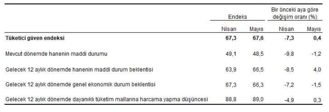 TÜİK ve Türkiye Cumhuriyet Merkez Bankası iş birliğiyle yürütülen "Tüketici Eğilim Anketi" sonuçlarından hesaplanan mevsim etkilerinden arındırılmış tüketici güven endeksi, mayısta bir önceki aya göre yüzde 0,4 arttı. Nisanda 67,3 olan endeks, mayısta 67,6 olarak kayıtlara geçti.