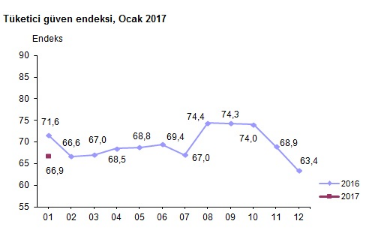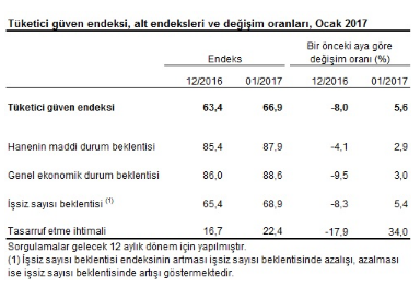 Türkiye İstatistik Kurumu ve Türkiye Cumhuriyet Merkez Bankası (TCMB) işbirliği ile yürütülen tüketici eğilim anketi sonuçlarından hesaplanan tüketici güven endeksi, 2017 Ocak ayında bir önceki aya göre yüzde 5,6 oranında arttı; 2016 Aralık ayında 63,4 olan endeks değeri 2017 Ocak ayında 66,9 oldu.