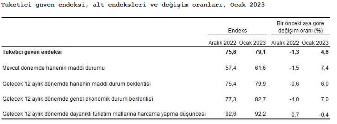 Aralık 2022'de 75,6 olan endeks, bu ay 79,1 olarak kayıtlara geçti. Böylece endeks, son 16 ayın en yüksek seviyesine ulaştı.