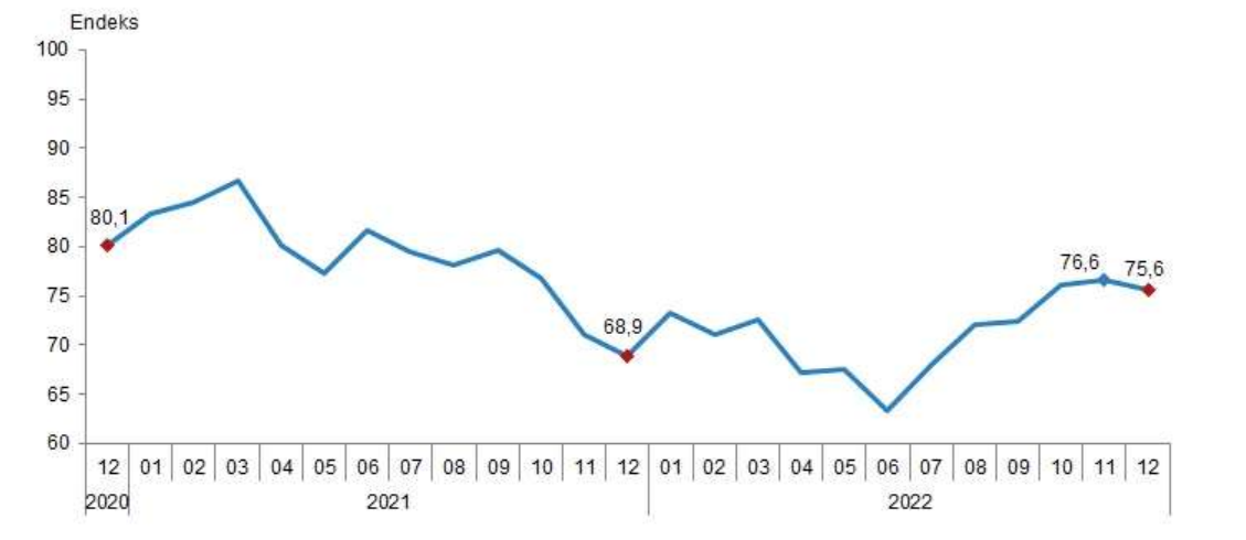 Buna göre, TÜİK ve Türkiye Cumhuriyet Merkez Bankası işbirliğiyle yürütülen "Tüketici Eğilim Anketi" sonuçlarından hesaplanan mevsim etkilerinden arındırılmış tüketici güven endeksi, aralıkta, geçen aya göre yüzde 1,3 azaldı. Kasımda 76,6 olan endeks, bu ay 75,6 olarak kayıtlara geçti.