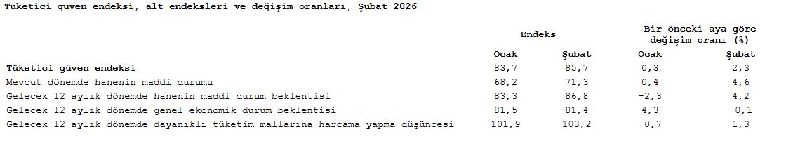 Türkiye İstatistik Kurumu ve Türkiye Cumhuriyet Merkez Bankası işbirliği ile yürütülen tüketici eğilim anketi sonuçlarından hesaplanan tüketici güven endeksi, Ocak ayında 83,7 iken Şubat ayında yüzde 2,3 oranında artarak 85,7 oldu.