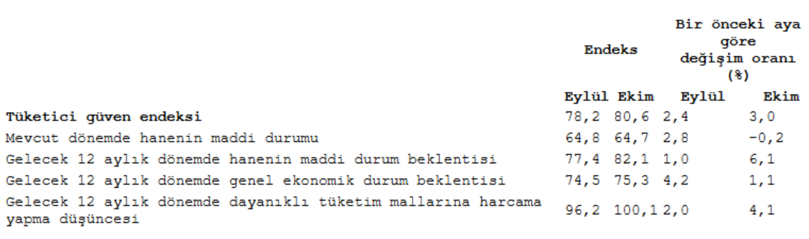 Buna göre, TÜİK ve Türkiye Cumhuriyet Merkez Bankası (TCMB) işbirliği ile yürütülen tüketici eğilim anketi sonuçlarından hesaplanan tüketici güven endeksi, eylülde 78,2 iken ekim ayında yüzde 3 artarak 80,6'ya çıktı.