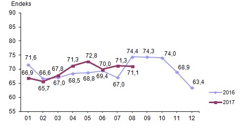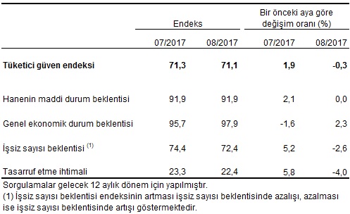 Türkiye İstatistik Kurumu ve Türkiye Cumhuriyet Merkez Bankası işbirliği ile yürütülen tüketici eğilim anketi sonuçlarından hesaplanan tüketici güven endeksi, ağustos ayında bir önceki aya göre yüzde 0,3 oranında azaldı; temmuz ayında 71,3 olan endeks ağustos ayında 71,1 oldu.