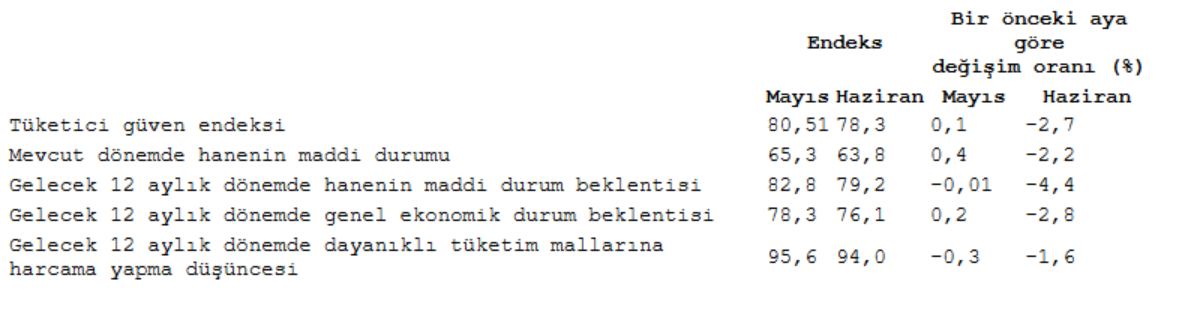 Buna göre, TÜİK ve Türkiye Cumhuriyet Merkez Bankası işbirliğiyle yürütülen tüketici eğilim anketi sonuçlarından hesaplanan mevsim etkilerinden arındırılmış tüketici güven endeksi, haziranda, mayıs ayına kıyasla yüzde 2,7 azaldı. Geçen ay 80,51 olan endeks, bu ay 78,3'e düştü.