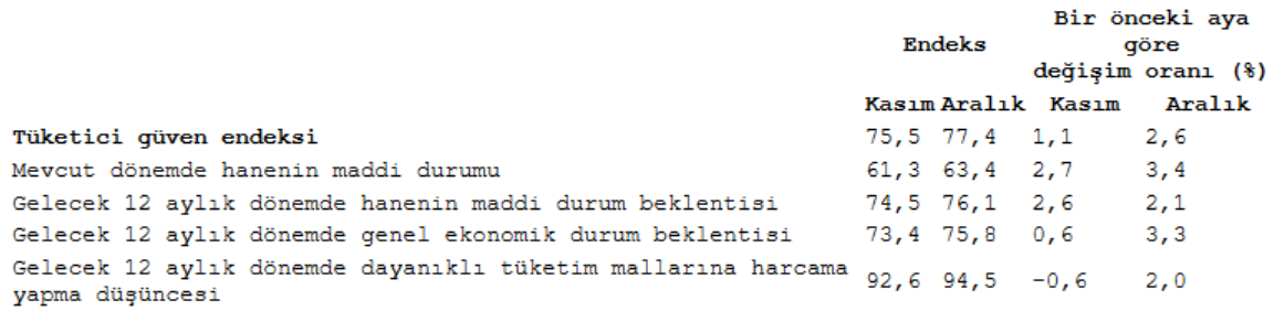 Türkiye İstatistik Kurumu ve Türkiye Cumhuriyet Merkez Bankası işbirliği ile yürütülen tüketici eğilim anketi sonuçlarından hesaplanan tüketici güven endeksi, Kasım ayında 75,5 iken Aralık ayında %2,6 oranında artarak 77,4 oldu.
