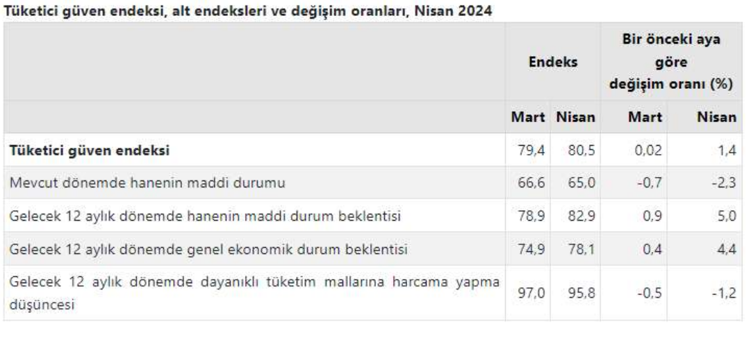 Buna göre, TÜİK ve Türkiye Cumhuriyet Merkez Bankası işbirliğiyle yürütülen "Tüketici Eğilim Anketi" sonuçlarından hesaplanan mevsim etkilerinden arındırılmış tüketici güven endeksi, nisanda, marta kıyasla yüzde 1,4 arttı. Geçen ay 79,4 olan endeks, bu ay 80,5 oldu.