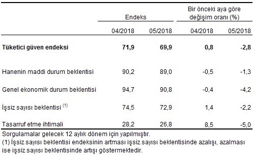 Türkiye İstatistik Kurumu ve Türkiye Cumhuriyet Merkez Bankası işbirliği ile yürütülen tüketici eğilim anketi sonuçlarından hesaplanan Tüketici Güven Endeksi, Mayıs ayında bir önceki aya göre %2,8 oranında azaldı; Nisan ayında 71,9 olan endeks Mayıs ayında 69,9 oldu