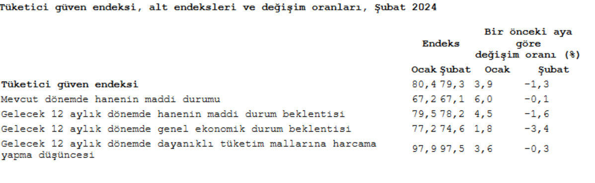 Buna göre, TÜİK ve Türkiye Cumhuriyet Merkez Bankası işbirliğiyle yürütülen "tüketici eğilim anketi" sonuçlarından hesaplanan mevsim etkilerinden arındırılmış tüketici güven endeksi, şubatta, geçen aya kıyasla yüzde 1,3 azaldı. Geçen ay 80,4 olan endeks, bu ay 79,3 oldu.