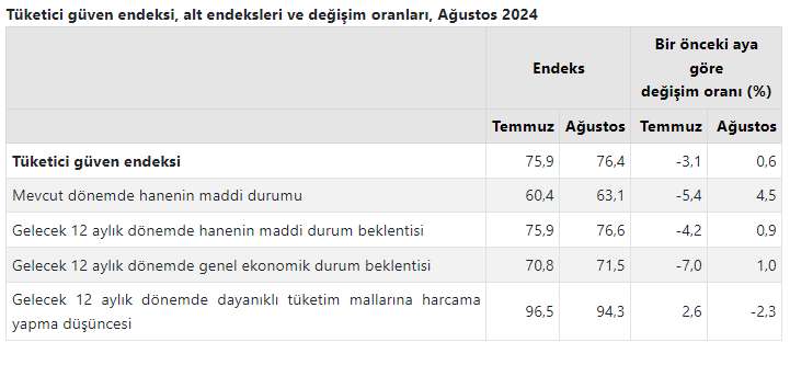 Buna göre, TÜİK ve Türkiye Cumhuriyet Merkez Bankası işbirliğiyle yürütülen "Tüketici Eğilim Anketi" sonuçlarından hesaplanan mevsim etkilerinden arındırılmış tüketici güven endeksi, ağustosta geçen aya kıyasla yüzde 0,6 arttı. Temmuzda 75,9 olan endeks, ağustosta 76,4 olarak kayıtlara geçti.