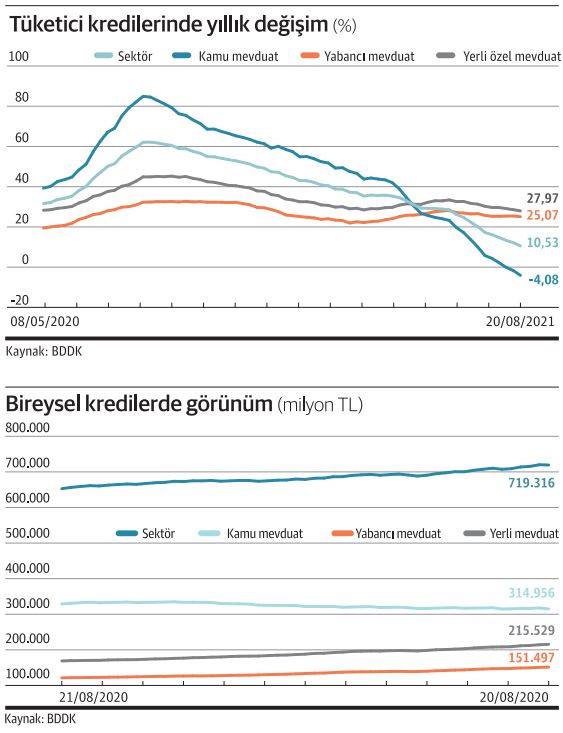 Bankacılık Düzenleme ve Denetleme Kurumu’nun haftalık verileri tüketici kredilerinde büyümenin yerli özel ve yabancı mevduat bankalarında olduğunu ortaya koyuyor. 20 Ağustos haftası itibariyle bankacılık sektöründe tüketici kredileri 2020 sonuna göre yüzde 6,41, geçen yıl aynı haftaya göre ise yüzde 10,2 büyüme gösterdi. Ancak bu kredi büyümesinde kamunun hiçbir payı yok. Öyle ki kamu mevduat bankaları tüketici kredilerinde yılsonuna göre yüzde 4,36, geçen yılın aynı haftasına göre ise yüzde 4,28 küçülme yaşadı. Dünya'dan Şebnem Turhan'ın haberine göre, geçen yıl pandemi döneminde ise kredi büyümesinin büyük çoğunluğunu kamu mevduat bankaları sırtlamıştı. Kamu mevduat bankaları geçen yıl mayıs ayı sonrasında tüketici kredilerinde çok hızlı bir büyüme göstermişti. Öyle ki geçen yıl ağustosta tüketici kredilerinde yıllık büyüme yüzde 85'e gelmişti. Ancak bu yıl haziran ayından itibaren kamu mevduat bankaları tüketici kredilerinde frene bastı. Önce tek haneli yıllık büyümeler yaşanırken ağustos ayı itibariyle kamu mevduat bankalarının tüketici kredilerinde daralmaya geçti. Kamu bankaları tüketici kredisi büyümesinde frene bassa da halen daha tüketici kredilerinin yüzde 44’ü yani 315 milyar lirası kamu mevduat bankaları tarafından karşılanmış durumda.