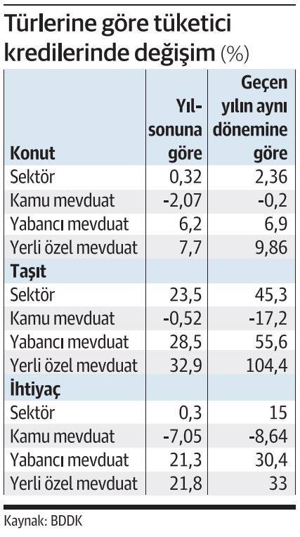 Hem Hazine ve Maliye Bakanı Lütfi Elvan’ın hem de Merkez Bankası’nın tüketici kredilerine yönelik sözleri yerli özel ve yabancı mevduat bankalarını daha fazla ilgilendiriyor gibi görünüyor. Kamu mevduat bankaları tüketici kredilerinde daralma gösteriyor. Uzmanlar yüzde 15 büyüme şartı getirilebileceğini dile getiriyor. Bu durumda yerli özel ve yabancı mevduat bankalarının özellikle taşıt ve ihtiyaç kredilerinde frene basmaları beklenti dahilinde.