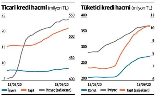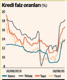 Dünya'dan Şebnem Turhan haberine göre, konut ve taşıt kredilerinde ise artış hızı oldukça yavaşladı. Konut kredileri 18 Eylül haftasında 276 milyar 545 milyon lira olurken 11 Eylül haftasına göre artış sadece yüzde 0,11 oldu. Kamu bankalarının haziran ayında başlayan kampanyası ile beraber konut kredisinde haftalık artışlar yüzde 4’e yaklaşmıştı. Taşıt kredisinde de ivme kaybı sürdü ve 18 Eylül haftasında 11 Eylül’e göre taşıt kredisi kullanımındaki büyüme yüzde 0,65 oldu. Taşıt kredisinde ise artışın en hızlı olduğu hafta 12 Haziran haftasıydı ve 5 Haziran’a göre 1 haftada kullanım yüzde 5,5 yükselmişti.