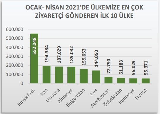 Türkiye, 2021 yılının ilk dört aylık döneminde en çok ziyaretçiyi 552 bin turist ile Rusya'dan aldı.