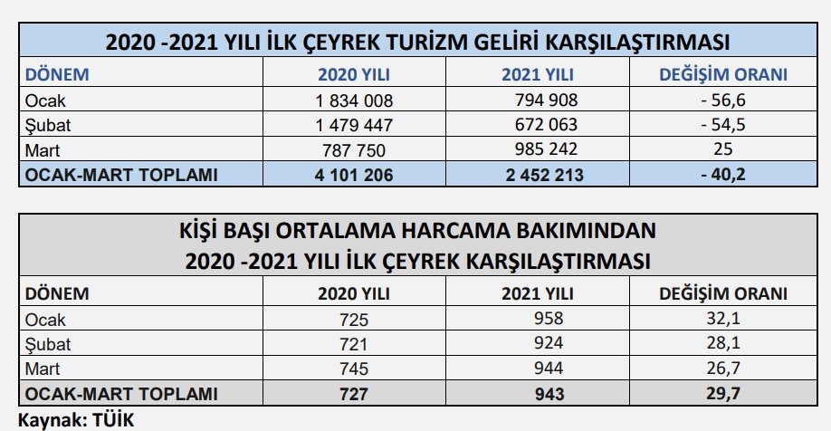 Türkiye İstatistik Kurumu (TÜİK) tarafından açıklanan verilere göre, Ocak, Şubat ve Mart aylarından oluşan 2021 yılının ilk çeyreğinde Türkiye'nin turizmden elde ettiği gelir, bir önceki yılın aynı dönemine göre yüzde 40,2 oranında azalarak, 2 milyar 452 milyon 213 bin dolar seviyesine düştü.