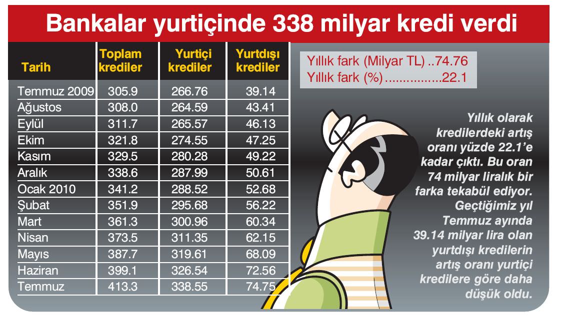 Özel sektörün Türkiye'deki borçlanma rakamlarına bakınca ibrenin Türkiye'ye döndüğü gözleniyor. 2010 yılının ilk yarısında kredi hacminde yaşanan toplam 62.2 milyar TL'lik artışın 26.8 milyar TL'si yani yüzde 43'lük bölümü kurumsal veya ticari kredilerden geldi. Toparlanma ve faizdeki düşüşün etkili olduğu ilk yarıdaki bu artışta banka grupları bazında oransal olarak en yüksek kredi artışı yüzde 17.4 ile özel bankalar ve yüzde 16.9 ile kamu bankalarında gerçekleşti. 2009 yıl sonu ile karşılaştırıldığında toplam kredilerde yüzde 15.8'e ulaşan bir artış gerçekleşirken, yabancı para cinsinden kredilerde ise dolar bazında yüzde 9.9 yani 6.9 milyar USD artış yaşandı. Öte yandan Haziran 2010 itibariyle bankacılık sektörü toplam kredilerinin yüzde 45,3'ü kurumsal ve ticari kredilerden, yüzde 32.5'i bireysel kredilerden, yüzde 22.1'i ise KOBİ kredilerinden oluştu. 2009 yılsonu ile karşılaştırıldığında KOBİ kredilerinin toplam krediler içindeki payında artış kurumsal ve ticari krediler ile bireysel kredilerin paylarında ise azalış var.