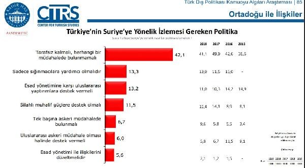 Ankete katılanların yüzde 42,1’i Türkiye’nin Suriye’ye yönelik izlemesi gereken politikanın tarafsız olması ve herhangi bir müdahalede bulunulmaması gerektiğini belirtirken, yüzde 13,3’ü ise sadece sığınmacılara yardımcı olması gerektiğini vurguladı.