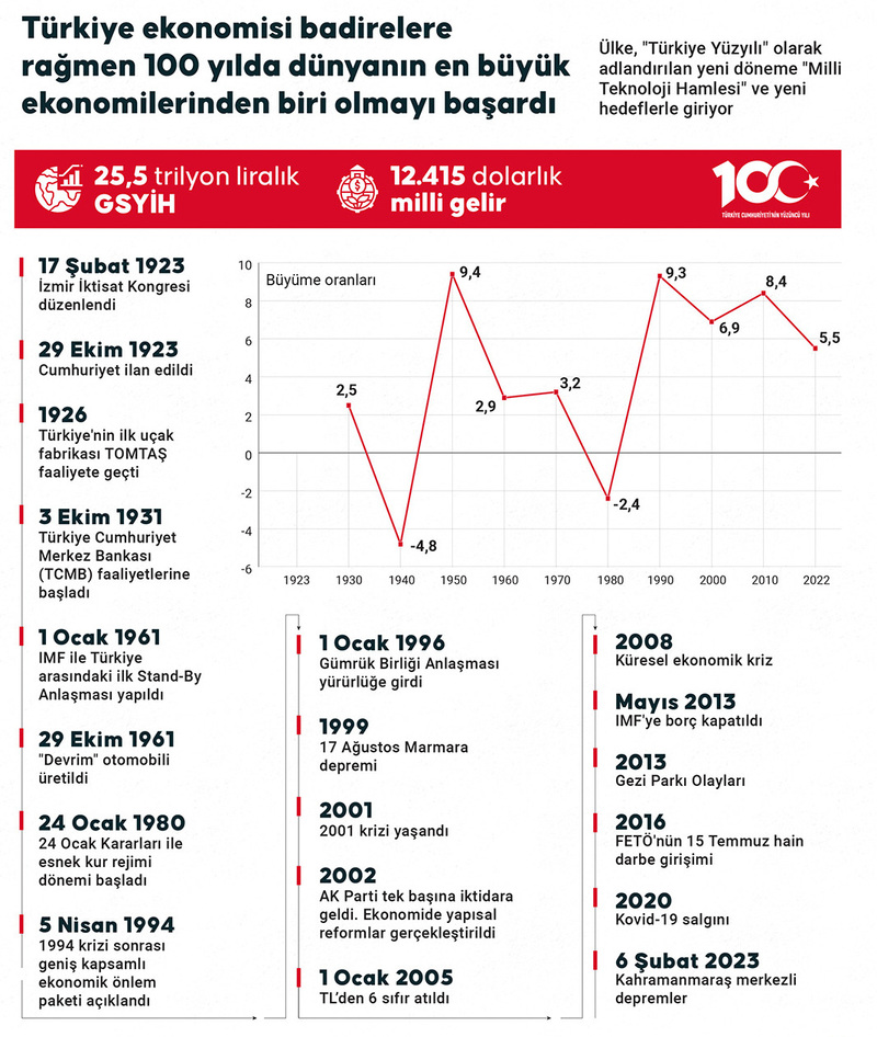 Türkiye ekonomisi badirelere rağmen 100 yılda dünyanın en büyük ekonomilerinden biri olmayı başardı. Cumhuriyet'in 100'üncü yıl dönümü dolayısıyla hazırlanan dosya haberler kapsamında, Türk ekonomisinin 100 yıllık serüveni ele alındı.