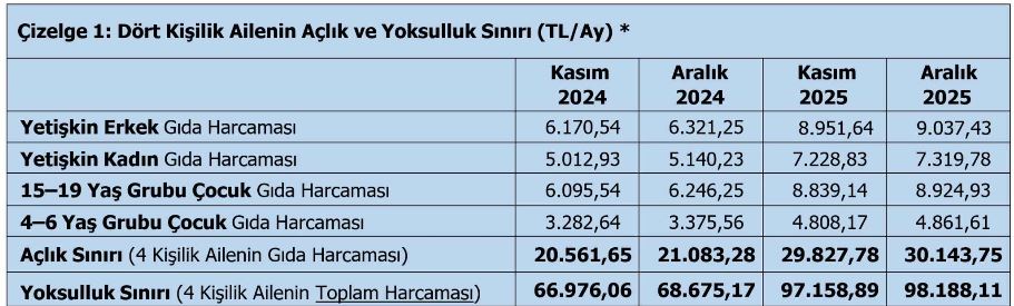 -Gıda harcaması ile giyim, konut (kira, elektrik, su, yakıt), ulaşım, eğitim, sağlık ve benzeri ihtiyaçlar için yapılması zorunlu diğer aylık harcamalarının toplam tutarı ise (yoksulluk sınırı) 98.188,11 TL’ye,