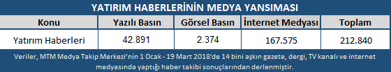 MTM’nin medya raporuna göre Ocak ayından bu yana yatırım ile ilgili yazı basın, görsel basın ve internet medyasında toplamda 212 bin 840 haberin yer aldığı belirlendi.