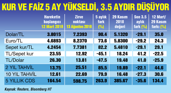 -Hazine faizlerinde de benzer eğilim ve performans söz konusu. 2 yıllık devlet tahvili 12 Mart’ta yüzde 13.75’den yükselişle 13 Ağustos’ta yüzde 25.51 ile rekor kırdı. 5 aylık faiz değişimi yüzde 85.5’i buldu. Bu oran, aynı dönemde doların artışına çok yakın. 13 Ağustos sonrasındaki düşüşle 29 Kasım’da 2 yıllık tahvil faizi yüzde 20’nin altına sarktı. Buradaki düşüş oranı da yüzde 22’yi buldu.