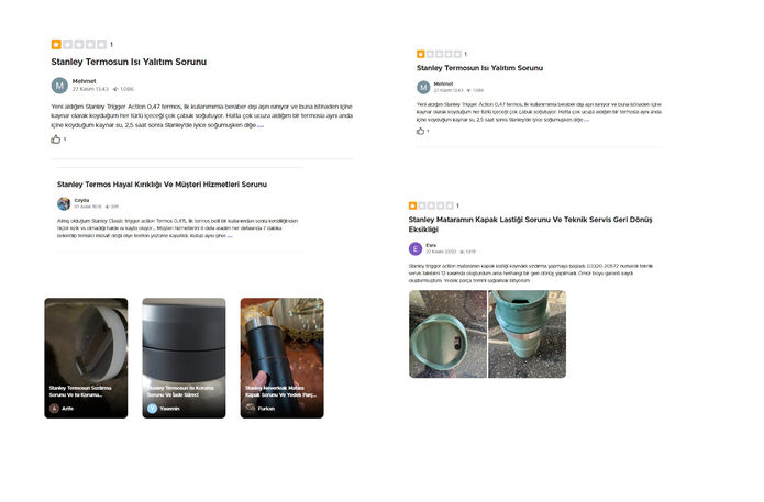 Şikayet Var'daki bir kullanıcı "Kullanmakta olduğum Stanley Klasik Trigger-Action Termos Bardak (0.47) modeli termosum sıcak içecekleri bir saat içinde neredeyse buz gibi soğutmaya başladı. Ürünü ilk aldığımda Kutupayısı üzerinden kayıt oluşturarak ömür boyu garanti sürecini başlatmış olmama rağmen ne oluşturduğum talebe bir dönüş alamadım" diğer kullanıcı da "Almış olduğum Stanley Classic trigger action Termos 0,47L lik termos belli bir kullanımdan sonra kendiliğinden hiçbir ezik vs olmadığı halde ısı kaybı oluyor... Müşteri hizmetlerini 8 defa aradım her defasında 7 dakika bekletilip temsilci müsait değil diye telefon yüzüme kapatıldı" ifadelerini kullandı.
