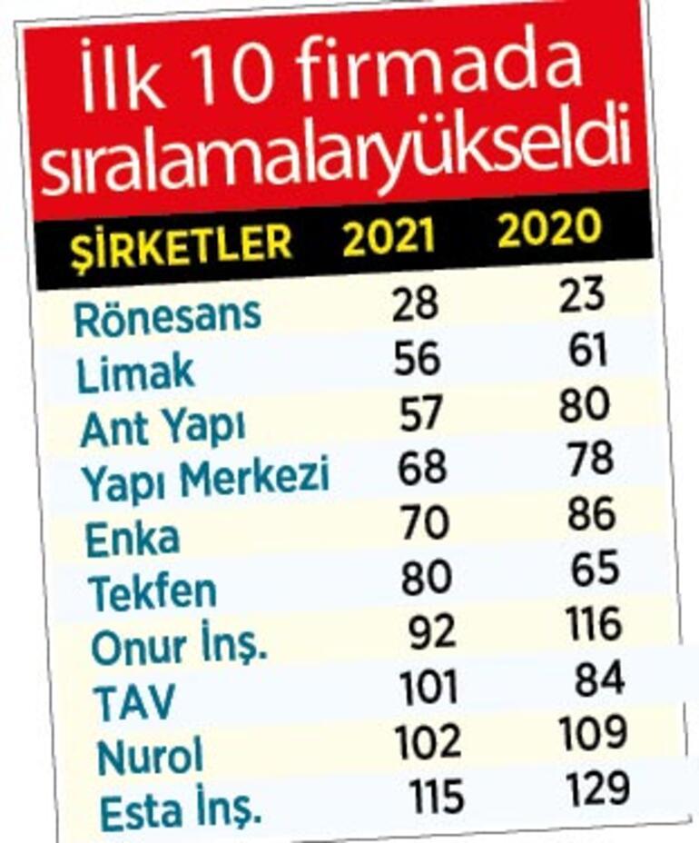 ‘Dünyanın En Büyük 250 Müteahhiti’ listesi uzun bir süre sonra değişti. Her yıl listedeki müteahhit firma sayısıyla Çin’in galip geldiği listede ikinciliğini koruyan Türkiye, 2020 yılı verilerinin baz alındığı 2021 listesinde üçüncü sıraya düştü. Amerikalı müteahhitlik firmaları ise ikincilik koltuğuna oturdu. Bu kapsamda dünyanın ilk 250 müteahhiti listesinde Çin’den 78 firma yer alırken, Amerika’dan 41, Türkiye’den ise 40 firma bulunuyor. Geçen yılki listede ABD’den 35, Türkiye’den 44 firma yer almıştı. Yeni listedeki bu tek firmalık fark, Türkiye’nin yerini değiştirse de, koronavirüs pandemisi koşullarında dünyada iş yapış koşulları, artan emtia fiyatları gibi pek çok nedene rağmen Türkiye’nin performansını ‘koruduğu’ şeklinde değerlendirildi. Buna göre sırasıyla Rönesans İnşaat, Limak, Ant Yapı, Yapı Merkezi, Enka, Tekfen, Onur İnşaat, TAV, Nurol, Esta İnşaat listede ilk 10 Türk firması olarak yer aldı. Bu firmalar genel sıralamada da konumlarını yükseltti.