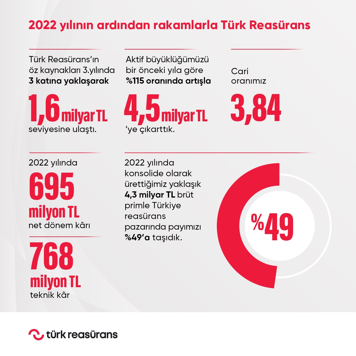 Türk Reasürans Genel Müdürü Selva Eren, kuruluşlarından bugüne kadar geçen süreçteki büyüme hakkında “6 Eylül 2019 tarihinde 150 milyon TL ödenmiş sermaye ile başladığımız yolculuğumuzda, 2022 yıl sonu itibarıyla 600 milyon TL olan kuruluş sermayemizin 3 katına yaklaşarak 1,6 milyar TL seviyelerine ulaştı. Aktif büyüklüğümüzü ise bir önceki yıla göre %115 oranında artışla 4,5 milyar TL’ye çıkardık.” açıklamalarında bulundu.