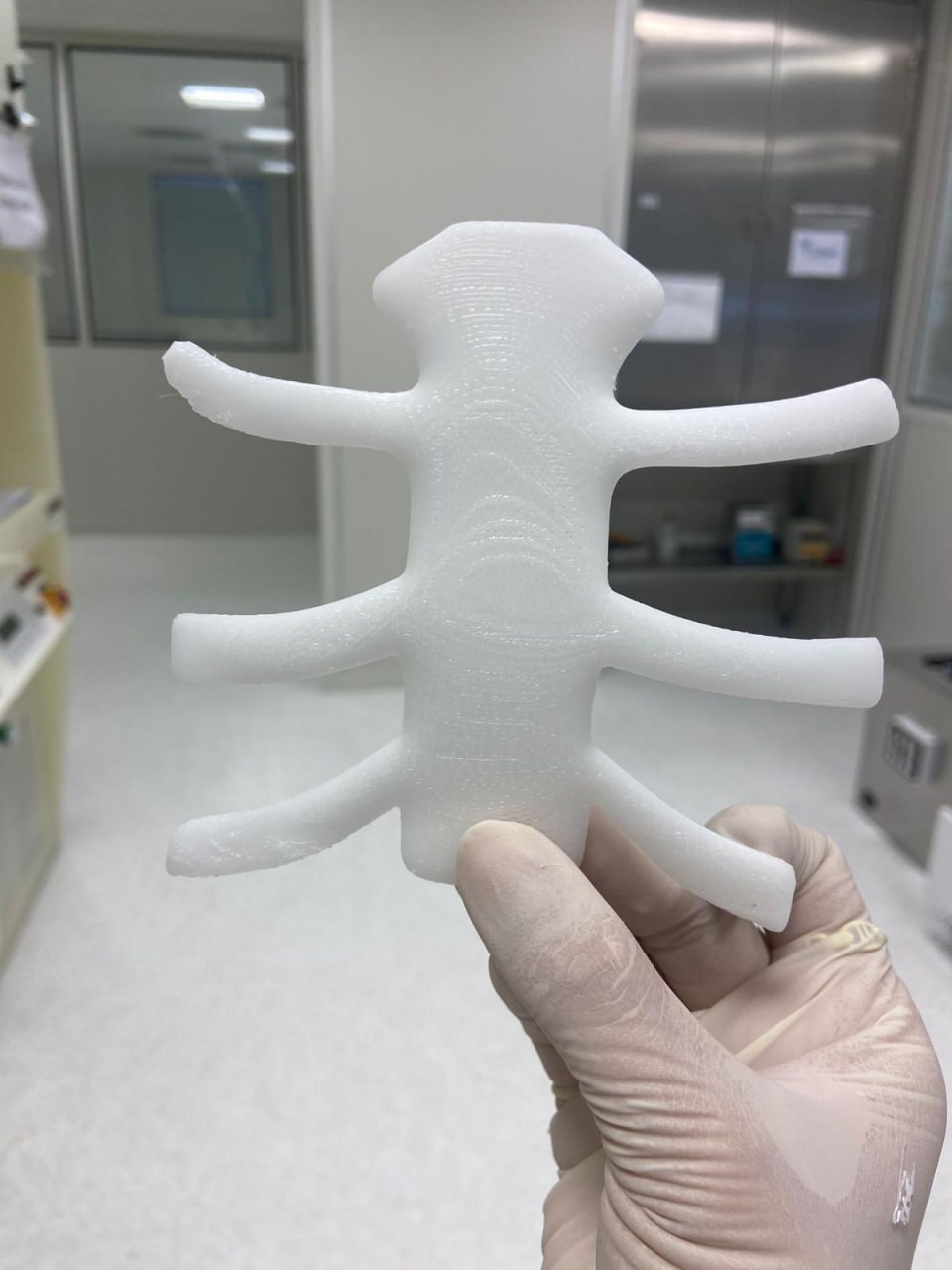 Bizim ürünümüzün biyomimitik bir yapısı var. Bu da doğal kemiğe çok yakın bir esneklik ve gözeneklilik sunuyor. Biz üretimlerimizi gözenekli bir yapı üzerinde hazırlıyoruz. Bu da vücut içerisine uygulandığı zaman çift taraflı damarlaşma (vaskülerizasyon) dediğimiz süreci sağlıyor. Cerrah herhangi bir operasyon sırasında, çok rahat bir şekilde bizim ürünümüzü alıp istediği gibimanipüle edebiliyor, onu matkapla çok rahat bir şekilde geçebiliyor, kesebiliyor, şekillendirebiliyor, fiksasyon yapabiliyor.