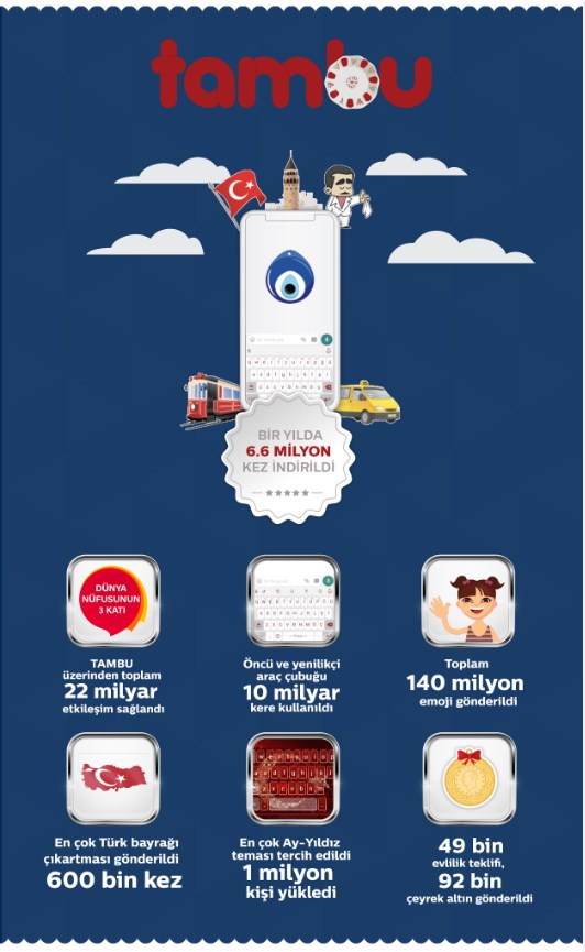 Tüketicilerle buluştuğu ilk günden bu yana toplam 588 milyon defa kullanılan TAMBU uygulamasındaki Türkiye’ye özel yaratılmış yerel temalar, atasözleri, çıkartmalar ve GIF’ler 68 milyon kere kullanıldı. Metin içinde paylaşılan unicode emojilerle beraber toplamda 140 milyon emoji ve çıkartmanın gönderildiği TAMBU’da en çok tercih edilen çıkartma ise Türk Bayrağı oldu. Bayrağımızın ardından kullanıcıların en çok ‘Öptüm’, ‘İyi Bayramlar’ ve ‘Seni Seviyorum’ hareketli çıkartmalarını tercih ettikleri gözlendi. Türk kültürüne özgü pek çok emojiyi barındıran TAMBU’da bunlara ek olarak sunulan kişiselleştirme özellikleri sayesinde şehre özel içerikler ve birbirinden farklı temalar da kullanıcıların tercihine sunulmuştu.