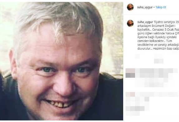 Süha Uygur yaptığı paylaşımda “Tiyatro sanatçısı 35 yıllık arkadaşım Ercüment Doğan’ı kaybettik… Cenazesi 5 Ocak Pazar günü öğlen vaktinde Yalova Çiftlikköy ilçesine bağlı İlyasköy içindeki camiden kalkacaktır… Tüm sevdiklerine ve sanatçı arkadaşlarımıza duyurulur… Hepimizin başı sağ olsun…” dedi.