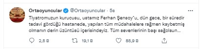 Ferhan Şensoy'un vefat haberini, kendisinin kurduğu 'Ortaoyuncular' tiyatro grubu Twitter'dan duyurdu.