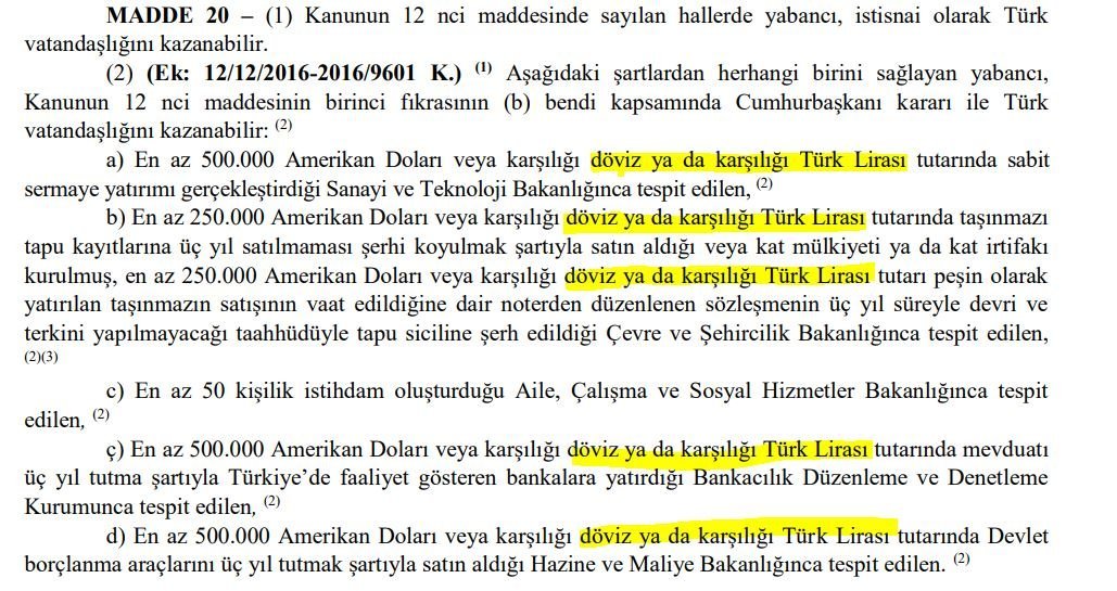 En az 500 bin Amerikan Doları ve karşılığı döviz tutarında mevduatı 3 yıl tutma şartıyla Türkiye’de faaliyet gösteren bankalara yatırdığı Bankacılık Düzenleme ve Denetleme Kurumunca tespit edilen.