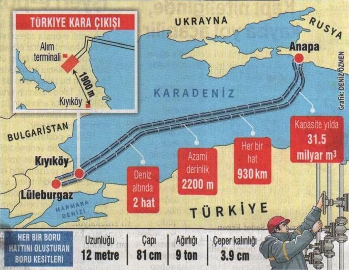 - TürkAkım 2 bin 200 metreye varan derinlikte döşenen en geniş (81 cm çapında) boru hattı olma özelliği taşıyor. Projede her biri 12 metre uzunluğunda ve 9 ton ağırlığında 158 bin boru kullanıldı.
