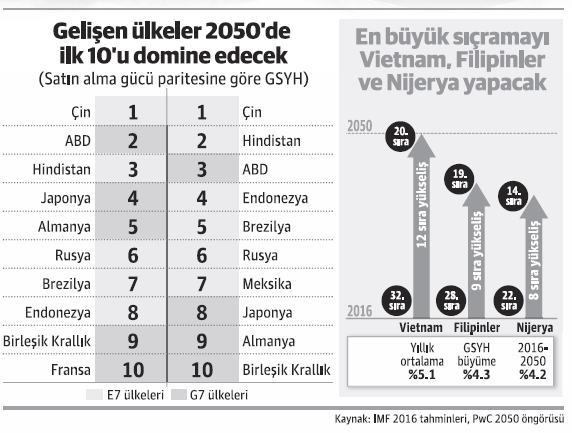 “World 2050” başılıklı araştırmada ABD, Kanada, Japonya, Almanya, İngiltere, Fransa ve İtalya’nın oluşturduğu gruba G7 deniyor. E7 ekonomileri ise Çin, Hindistan, Brezilya, Rusya, Endonezya, Meksika ve Türkiye’den oluşuyor. 2050’de dünyanın en büyük 10 ekonomisi listesini E7 ülkeleri adeta domine edecek. İlk altıda G7 ülkelerinden sadece ABD yer alırken Çin ve Hindistan ilk iki sırayı paylaşacak. Endonezya dördüncü sıraya otururken onu Brezilya, Rusya ve Meksika izleyecek. PwC’nin tahminlerinin tutması halinde 190 ülkenin yer aldığı sıralamada en büyük sıçramayı, Vietnam, Filipinler ve Nijerya gerçekleştirecek. Vietnam 12, Filipinler 9 ve Nijerya da 8 basamak birden yükselecek.
