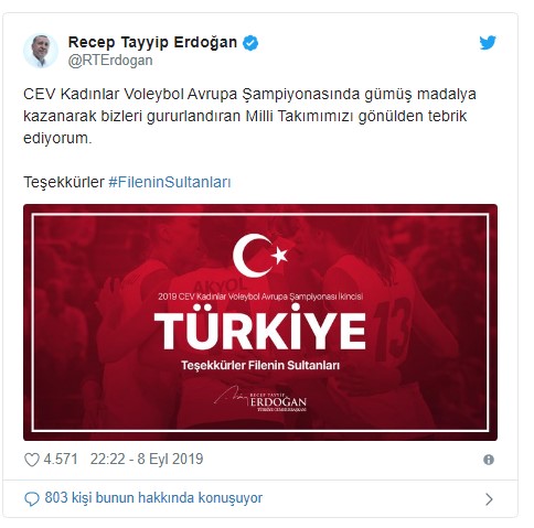 Cumhurbaşkanı Recep Tayyip Erdoğan, Twitter'dan paylaştığı mesajla Türkiye A Milli Kadın Voleybol Takımı'nı kutladı.